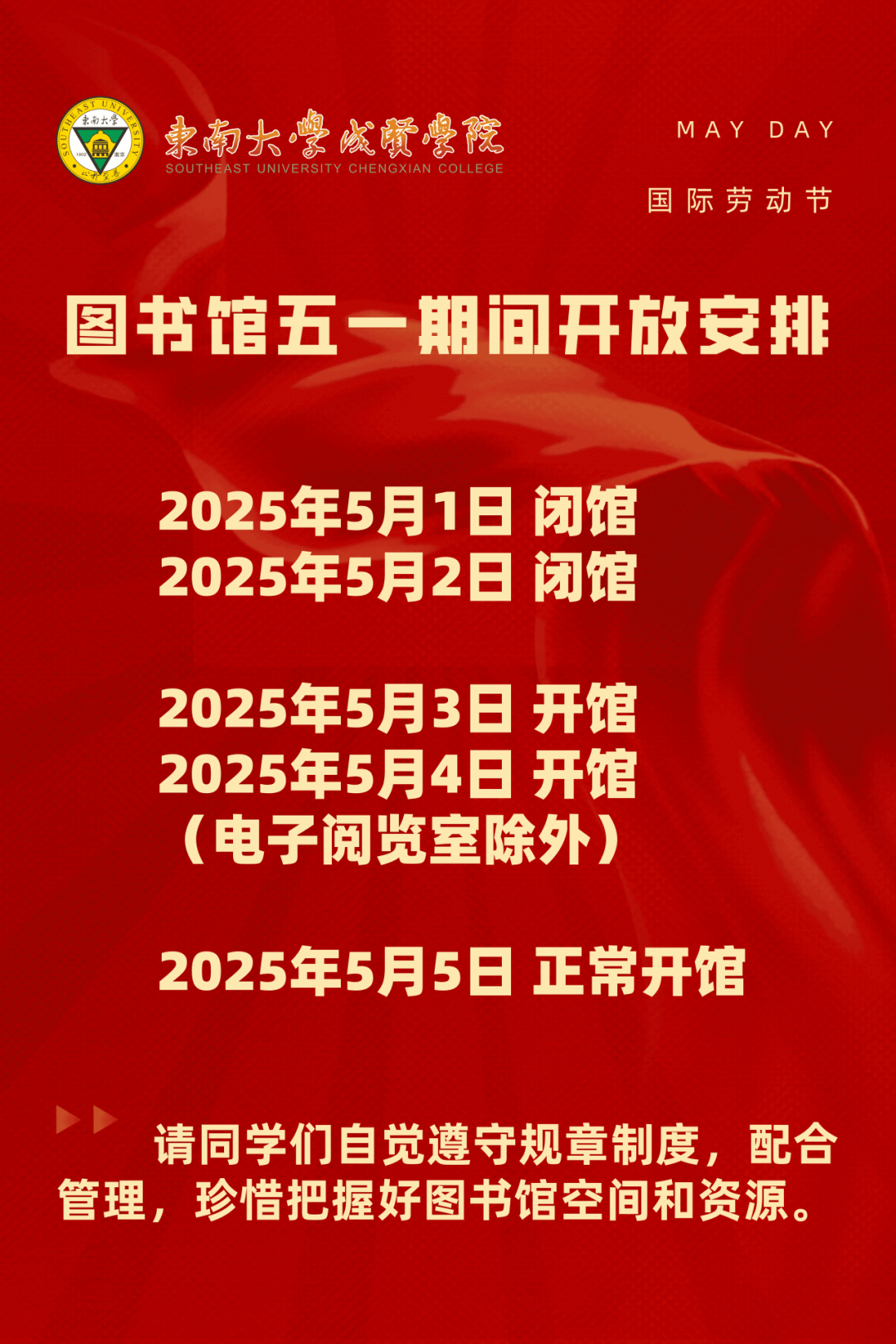 2025年5月1日 闭馆2025年5月2日 闭馆2025年5月3日 开馆2025年5月4日 开馆(电子阅览室除外)2025年5月5日 正常开馆